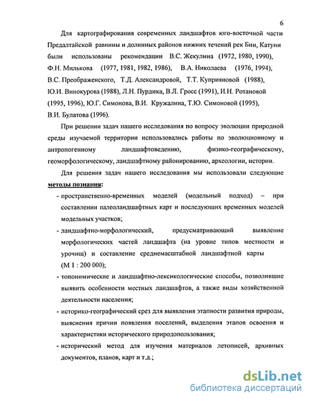 Исходя из цели и задач исследования, в основе работы - историко-ландшафтный (историко-географический) подход (по B.C. Жекулину), при котором современные ландшафты юго-восточной части Предалтайской равнины и их освоенность человеком рассматриваются как результат эволюции природной среды в голоцене, как производные предшествующих этапов заселения, расселения и производительной деятельности человеческого общества. В целом, вопросы определения возраста, эволюции ландшафтов и их морфологических единиц являются достаточно сложными и во многом проблемными.