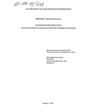 Во введении обосновывается актуальность темы, цель и задачи исследования, его объект, научная новизна, практическая значимость, формулируются основные положения, выносимые на защиту. В главе 1 рассмотрена эволюция природной среды (природных ландшафтов) в голоцене. В главе 2 дана характеристика современных природных ландшафтов юго-восточной части Предалтайской равнины. В главе 3 рассматривается история освоения и антропогенной трансформации изучаемой территории. В заключении подведены итоги исследования, сформулированы основные выводы.