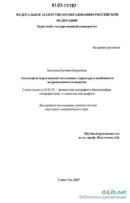 Объектом исследования являются ландшафты Баргузинской котловины, входящие в провинцию байкальских котловин, территория которой, относится к интенсивно освоенным районам Бурятии, где природные комплексы подверглись значительной хозяйственной деятельности человека.