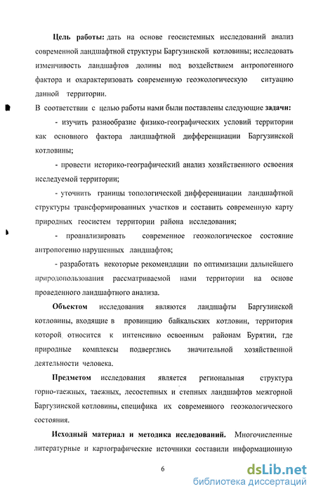 Предметом исследования является региональная структура горно-таежных, таежных, лесостепных и степных ландшафтов межгорной Баргузинской котловины, специфика их современного геоэкологического состояния.