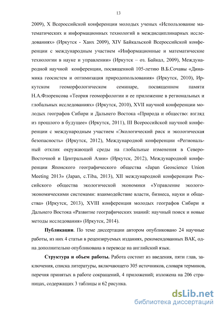 Апробация результатов исследования. Основные результаты диссертационного исследования докладывались на 11 международных и региональных конференциях, совещаниях и семинарах: «Системы географических знаний» (Иркутск, 2008), «Использование математических и информационных технологий в междисциплинарных исследованиях» (Иркутск - Ханх 2009), «Информационные и математические технологии в науке и управлении» (Иркутск - оз. Байкал, 2009), «Динамика геосистем и оптимизация природопользования» (Иркутск, 2010), «Теория геоморфологии и ее приложение в региональных и глобальных исследованиях» (Иркутск, 2010), «Природа и общество: взгляд из прошлого в будущее» (Иркутск, 2011), «Региональный отклик окружающей среды на глобальные изменения в Северо-Восточной и Центральной Азии» (Иркутск, 2012), «Управление эколого-экономическими системами: взаимодействие власти, бизнеса, науки и общества» (Иркутск, 2013), «Развитие географических знаний: научный поиск и новые методы исследования» (Иркутск, 2014).