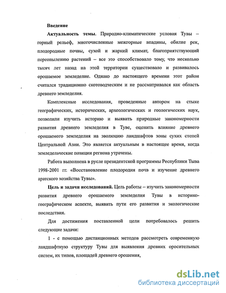Актуальность темы. Природно-климатические условия Тувы -горный рельеф, многочисленные межгорные впадины, обилие рек, плодородные почвы, сухой и жаркий климат, благоприятствующий переопылению растений - все это способствовало тому, что несколько тысяч лет назад на этой территории существовало и развивалось орошаемое земледелие. Однако до настоящего времени этот район считался традиционно скотоводческим и не рассматривался как область древнего земледелия.