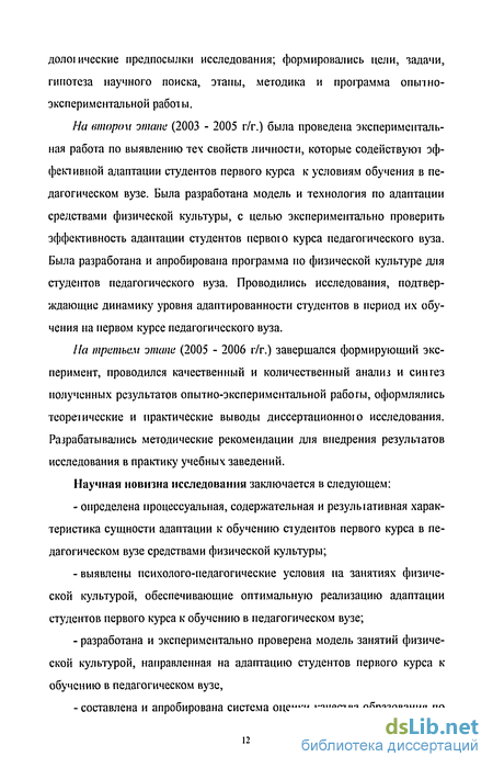 На первом этапе (2002- 2003 г/г.) изучалась философская, социоло-і ическая, психологическая и педаюгическая литература, диссергационные исследования по проблеме адаптации студентов к обучению в педагогическом вузе. Определена сущность и структура процесса адаптации студентов к условиям педагогическою вуза. Были выявлены социально-педаюгические факторы, влияющие на процесс формирования личности студентов в период их адаптации к обучению. Был рассмотрен вопрос о значении физической культуры в системе высшего профессионального образования и определены содержание, формы и методы проведения занятий физической культурой, способствующие эффективной адаптации студентов первою курса педагогического вуза. Па этом этапе определялись мето-