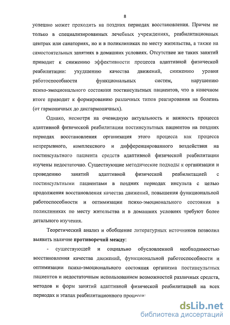 Одним из современных видов деятельности на всех этапах и периодах реабилитации, восстанавливающим качество движений и улучшающим физическую и функциональную работоспособность постинсультных пациентов является адаптивная физическая реабилитация (А.Г. Трушкин, 2001; Ф.М.Соколова, 2009; Л.Г.Тарасова, 2009). Именно она способствует восстановлению утраченных в результате заболевания движений, активизирует резервные возможности функциональных систем организма и адаптирует постинсультных пациентов к условиям внешней среды (Л.Н. Анисимова, 2000; В.А.Парфенова, 2001; А.Н. Белова, 2003; Ю.В. Нивина, 2004; О.В.Панина, 2005; В.И. Скворцова 2006; В.В.Ковальчук, 2008;Чжан Хай Цзяо, 2010). Однако, несмотря на очевидную актуальность и важность непрерывности адаптивной физической реабилитации, организация этого процесса на поздних периодах восстановления постинсультных пациентов изучена недостаточно (А.С. Кадыков, 1997; Т.В. Новикова, 2004; Т.Д. Демиденко, 2004; Ф.В. Тахавиева 2004;, Б.С. Виленский 2005; Ю.В. Гольдблат, 2006; В.А.Епифанов, 2006; Э.М. Аркачаа, 2006; Л.Г. Тарасова,2009; Е.Р. Файзулин,2009; В.В. Гусев,2009).