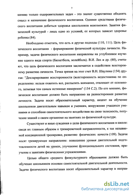 Необходимо отметить, что есть и другие подходы (110, 111). Цель физического воспитания - формирование физической культуры личности. Например, задачи физического воспитания направлены на углубленное изучение одного вида спорта (баскетбола, волейбола). В.И. Лях и др. (60), считают, что цель физического воспитания заключается в содействии всестороннему развитию личности. Точка зрения на этот счет В.Н. Шаулина (154) другая: "Декларирование всесторонности (всесторонность недостижима по определению: нельзя охватить все, распылять внимание, отвлекает от основного, затмевая тем самым истинные намерения" (154 С.2). По его мнению, физическое воспитание должно быть направлено на разностороннее развитие личности. Задачи носят образовательный характер, акцент на обучение школьников двигательным навыкам и умениям, вооружение учащихся умениями и способами самостоятельного воздействия на свою телесность, получение знаний о своем организме на занятиях по физической культуре.