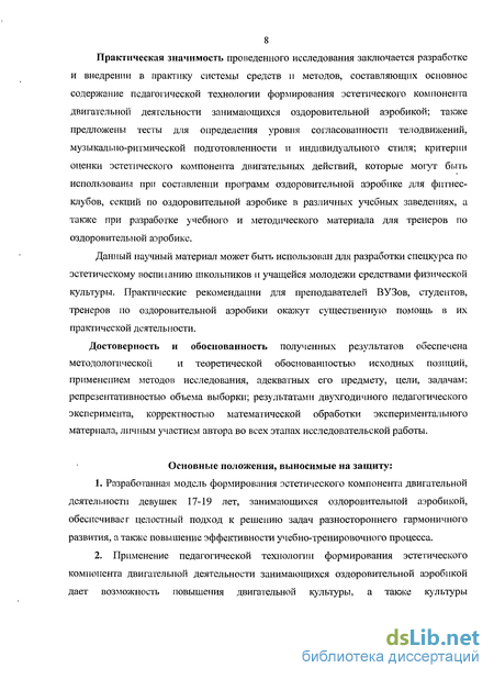 Теоретическая значимость исследования заключается в разработке, научном обосновании и экспериментальном подтверждении перспективного направления в развитии оздоровительной аэробики, позволяющего решать задачи формирования эстетического компонента двигательной деятельности как ведущего условия физического и духовного развития. Материалы исследований дополняют теорию и методику физического воспитания по разделу - «эстетическое воспитание средствами физической культуры и спорта», что способствует углублению и расширению знаний в области физической культуры и спорта.