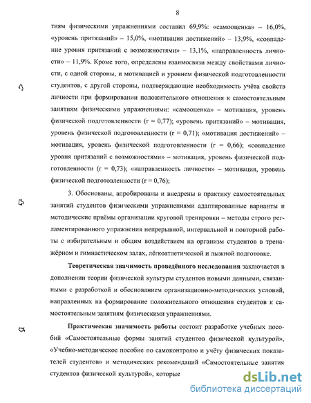 Практическая значимость работы состоит разработке учебных пособий «Самостоятельные формы занятий студентов физической культурой», «Учебно-методическое пособие по самоконтролю и учёту физических показателей студентов» и методических рекомендаций «Самостоятельные занятия студентов физической культурой», которые могут использоваться студентами