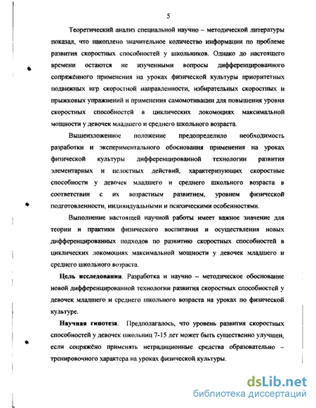 Цель исследования. Разработка и научно - методическое обоснование новой дифференцированной технологии развития скоростных способностей у девочек младшего и среднего школьного возраста на уроках по физической культуре.