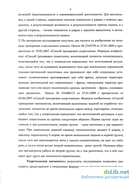 2. По материалам исследования получены два патента на изобретение по методике тренировки в настольном теннисе. Патент № 2344759 от 27.01.2009 с приоритетом от 19.02.2007 «Способ тренировки спортсмена». Формула изобретения: «Способ тренировки спортсмена, включающий элементы психотренинга, отличающийся тем, что у теннисистов определяют тип вегетативной регуляции, после чего на основании выявленного типа при выполнении упражнений технико-тактической подготовки они произносят про себя следующие установки: симпатотоники проговаривают про себя фразы, детально характеризующие двигательный акт, нормотоники — фразы, чередующие характер применения того или иного технического приема, ваготоники — фразы, усиливающие движение». Патент № 234480127 от 27.01.2009 с приоритетом от 04.06.2007 «Способ тренировки спортсменов». Формула изобретения: «Способ тренировки теннисистов, включающий выполнение заданий по отработке технических элементов во время розыгрыша шаров между партнерами, отличаю- щиися тем, что у спортсменов определяют тип вегетативной регуляции и разбивают спортсменов на группы следующим образом. Первая группа: один ва- готоник и три симпатотоника, вторая группа — один ваготоник и два нормото- ника. При выполнении заданий каждому симпатотонику выдают 6 шаров, а каждому нормогонику 8 шаров, во время выполнения задания в первой группе, после того как заканчиваются мячи у одного симпатотоника, он идет их собирать, а на его место встает второй симпатотоник, затем третий. Похожим образом организуется работа во второй группе, но с тем различием, что в ней сменяют друг друга два теннисиста-нормотоника».