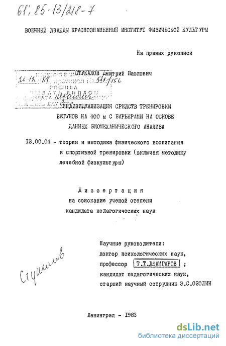 Стукалов Дмитрий Павлович. Индивидуализация средств тренировки бегунов на 400 м с барьерами на основе данных биомеханического анализа : ил РГБ ОД 61:85-13/218