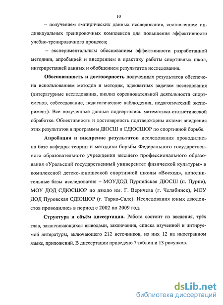 Апробация и внедрение результатов исследования проводились на базе кафедры теории и методики борьбы Федерального государственного образовательного учреждения высшего профессионального образования «Уральский государственный университет физической культуры» и комплексной детско-юношеской спортивной школы «Восход», дополнительные базы исследования - МОУДОД Пурпейская ДЮСШ (п. Пурпе), МОУ ДОД СДЮСШОР по дзюдо им. Г. Веричева (г. Челябинск), МОУ ДОД Пуровская СДЮШОР (г. Тарко-Сале). Исследования юных дзюдоистов проводились в период с 2002 по 2009 год.