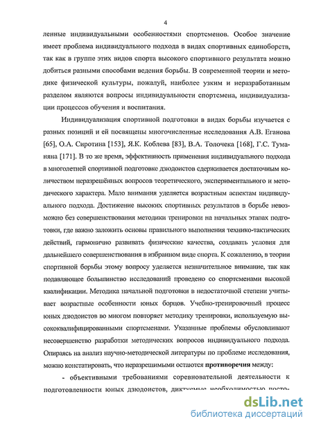Индивидуализация спортивной подготовки в видах борьбы изучается с разных позиций и ей посвящены многочисленные исследования А.В. Еганова [65], О.А. Сиротина [153], Я.К. Коблева [83], В.А. Толочека [168], Г.С. Туманяна [171]. В то же время, эффективность применения индивидуального подхода в многолетней спортивной подготовке дзюдоистов сдерживается достаточным количеством неразрешённых вопросов теоретического, экспериментального и методического характера. Мало внимания уделяется возрастным аспектам индивидуального подхода. Достижение высоких спортивных результатов в борьбе невозможно без совершенствования методики тренировки на начальных этапах подготовки, где важно заложить основы правильного выполнения технико-тактических действий, гармонично развивать физические качества, создавать условия для дальнейшего совершенствования в избранном виде спорта. К сожалению, в теории спортивной борьбы этому вопросу уделяется незначительное внимание, так как подавляющее большинство исследований проведено со спортсменами высокой квалификации. Методика начальной подготовки в недостаточной степени учитывает возрастные особенности юных борцов. Учебно-тренировочный процесс юных дзюдоистов во многом повторяет методику тренировки, используемую высококвалифицированными спортсменами. Указанные проблемы обусловливают несовершенство разработки методических вопросов индивидуального подхода. Опираясь на анализ научно-методической литературы по проблеме исследования, можно констатировать, что неразрешимыми остаются противоречия между: