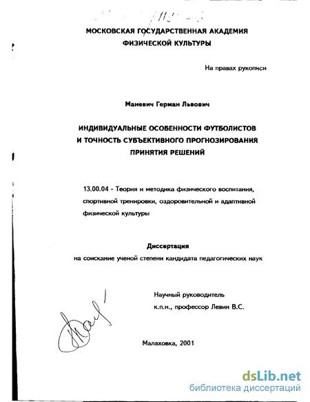 Предмет исследования - взаимосвязь индивидуальных особенностей субъективного прогнозирования у футболистов с физическими данными, технической подготовленностью, индивидуально-типологическими свойствами и психофункциональным состоянием, эффективностью соревновательной деятельности.