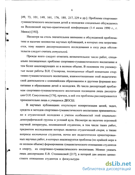 В научных публикациях отсутствует конкретизация целей, задач, средств и методов спортивно-гуманистического воспитания применительно к студенческой молодежи с учетом особенностей этой социально-демографической группы и условий вуза. Несмотря на наличие огромной научной литературы, посвященной студентам, в том числе таких работ, предметом исследования которых является студенческий спорт, а также вопросы воспитания студентов, почти нет педагогически ориентированных научных работ, в которых анализируется проблема (по крайней мере в ее полном объеме) формирования гуманистического отношения студентов к спорту, их спортивно-гуманистического воспитания. Можно указать лишь диссертацию Е.В. Стопниковой [217], в которой дан анализ ценностного отношения студентов к физкультурно-спортивной деятельности.
