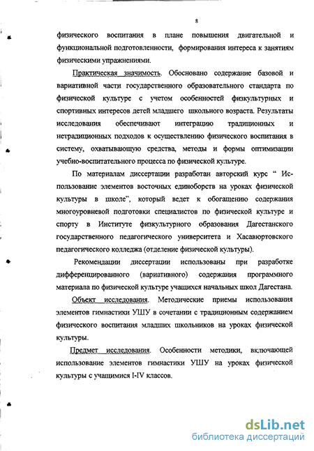 Объект исследования. Методические приемы использования элементов гимнастики УШУ в сочетании с традиционньш содержанием физического воспитания младших школьников на уроках физической культуры.