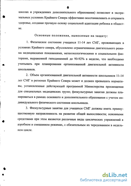 - обосновано чередование в недельном цикле различных видов физических упражнений, выполняемых в аэробном и смешанном режимах, с учетом динамики физического состояния школьников СМГ и региональных особенностей Крайнего Севера.