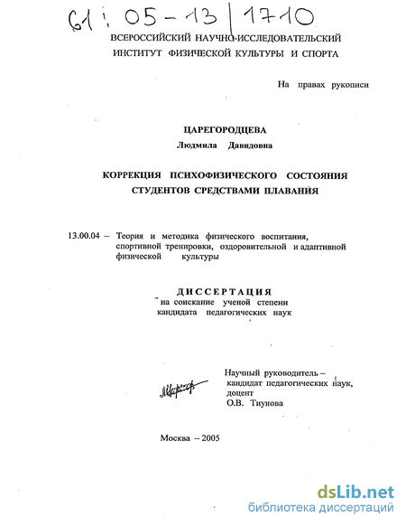 Предмет исследования: методика физической подготовки студентов основной медицинской группы (специализация плавание), учитывающая исходное психоэмоциональное состояние занимающихся.