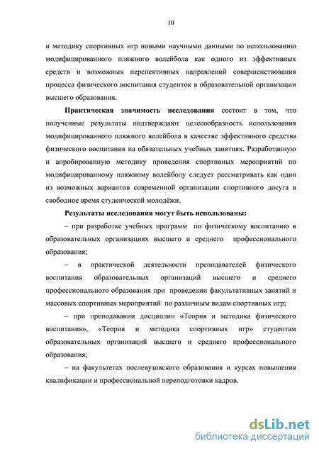 и методику спортивных игр новыми научными данными по использованию модифицированного пляжного волейбола как одного из эффективных средств и возможных перспективных направлений совершенствования процесса физического воспитания студенток в образовательной организации высшего образования.