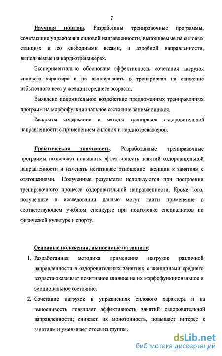 Экспериментально обоснована эффективность сочетания нагрузок силового характера и на выносливость в тренировках на снижение избыточного веса у женщин среднего возраста.