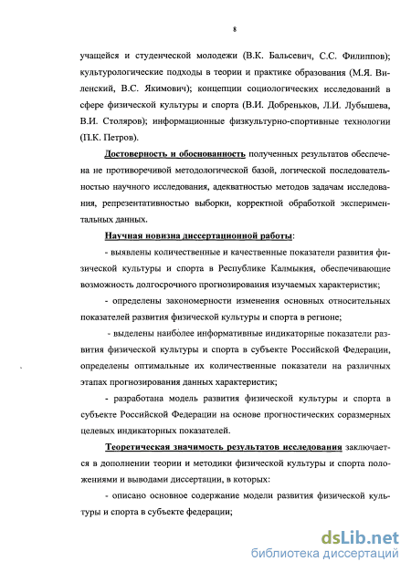Практическая значимость исследования заключается в том, что использование разработанной авторской модели развития физической культуры и спорта в Республике Калмыкия обеспечивает объективность прогнозирования развития физической культуры и спорта в субъекте Российской Федерации, более результативное их развитие.