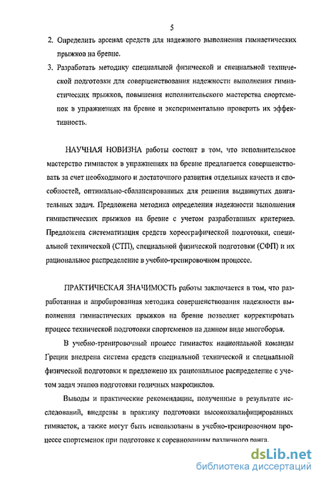 НАУЧНАЯ НОВИЗНА работы состоит в том, что исполнительское мастерство гимнасток в упражнениях на бревне предлагается совершенствовать за счет необходимого и достаточного развития отдельных качеств и способностей, оптимально-сбалансированных для решения выдвинутых двигательных задач. Предложена методика определения надежности выполнения гимнастических прыжков на бревне с учетом разработанных критериев. Предложена систематизация средств хореографической подготовки, специальной технической (СТП), специальной физической подготовки (СФП) и их рациональное распределение в учебно-тренировочном процессе.