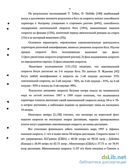 По результатам исследований Т. Tellez, D. Dolittle [180] наибольший вклад в достижение высокого результата в беге на скорость вносит способность спринтера к быстрому ускорению в стартовом разгоне (64%), способность I поддержания максимальной скорости бега (18%), минимизация падения скорости на финише (12%), латентный период двигательной реакции на старте (1%) и ее моторный компонент (5%). Основным параметром, отражающим соревновательную деятельность спринтеров различной квалификации, является динамика скорости бега. Изучая кривую скорости бега исследователи выделяют три фазы: 1) фаза увеличения скорости (стартовый разгон); 2) фаза поддержания скорости на определенном отрезке; 3) фаза снижения скорости. Некоторые исследователи [151,152] полагают, что максимальной скорости бегун достигает на 5-6 секунде бега. По данным Л. Жданова [42] бегун любой квалификации и возраста на 1-ой секунде достигает 55% максимальной скорости, на 2-ой секунде - 76%, на 3-ей секунде - 91%, на 4-ой секунде - 95% и только на 5-ой секунде -99%. Результаты динамики скорости бегунов экстра класса на чемпионатах мира по легкой атлетике 1997 и 1999 годов показали, что выдающиеся спринтеры планеты достигают своей максимальной скорости между 50-м и 70-м метром дистанции, а небольшое падение ее происходит лишь на последних 10 метрах. Некоторые авторы [5,158] считают, что несмотря на известный факт падения скорости на последних метрах дистанции, хорошо тренированные атлеты могут удерживать максимальную скорость до конца дистанции. Все участники финального забега чемпионата мира 1997 в Афинах показали скорость 11 м/с и выше после 30 метров дистанции. Скорость выше м/с удерживалась М.Грином (США) с 40.20 метра по 90.36 метр ; Д.Бейли (Канада) с 36.94 метра по 82.75 метр ; Монтгомери (США) с 37.73 м. по 76.91 метр дистанции. Максимальная скорость 11.87 м/с была показана и Грином и Бейли и достигнута она была примерно на 60-м метре дистанции, причем имела всего один пик [170]. Сравнивая результаты исследований динамики скорости нынешних сильнейших бегунов планеты и спринтеров 70-х годов, можно заметить тенденцию к формированию более качественной структуры соревновательного бега. Несмотря на то, что мировой рекорд в беге на 100 метров за последние 30 лет изменился всего лишь 0.16 сек. никто из участников 70-х годов /Э.Фигерола (Куба), Д.Ньюмен (США), В.Борзов (СССР)/ не достигал своей максимальной скорости равномерным по всей дистанции ускорением [49]. Современный рост достижений требует постепенного потока новых, научно-обоснованных форм и методов подготовки бегунов на короткие дистанции. По мнению Столяра К.Э. [111] значительное улучшение результата у ведущих спринтеров мира происходит на участке от старта до 60-го метра дистанции за счет совершенствования стартового разгона и переходу к бегу с максимальной скоростью. Для достижения максимальной скорости современные спринтеры в начале дистанции (к 20-му метру) используют максимальное увеличение темпа движений и лишь затем переходят на увеличение их амплитуды. Автор считает, что наметилась тенденция максимального темпа беговых движений, компенсируемая увеличением средней длины шага. При темпе движений 4.7-4.85 м/с средняя длина шага равна 2.50-2.65 м (скорость бега максимальная). Оптимальное сочетание темпа движений (94-95% от максимального) и длины бегового шага (98-99% от максимального) позволяет по мнению автора ве