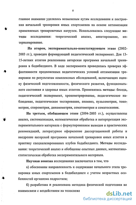 На первом поисково-теоретическом этапе (1999-2001 гг.) изучалась научно-методическая литература по теме диссертационной работы. Опрашивались тренеры по бодибилдингу, работающие с подростками, и сами юные атлеты. Осваивались и апробировались информативные методики врачебно-педагогического контроля, позволяющие осуществлять оценку эффективности управления спортивной тренировкой. При этом