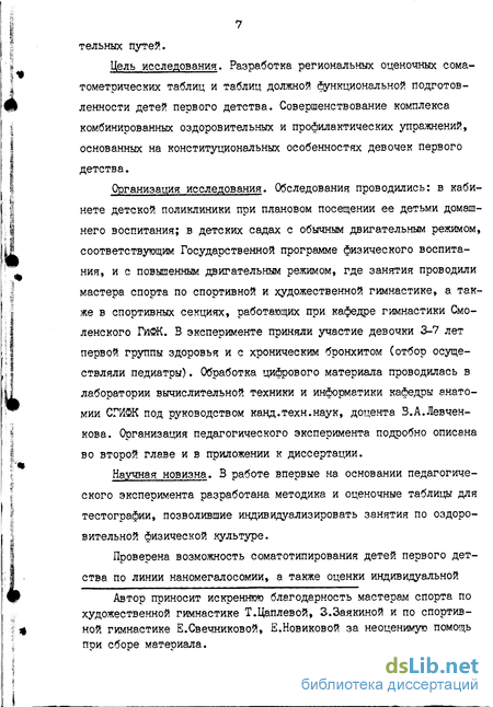 Организация исследования. Обследования проводились: в кабинете детской поликлиники при плановом посещении ее детьми домашнего воспитания; в детских садах с обычным двигательным режимом, соответствующим Государственной программе физического воспитания, и с повышенным двигательным режимом, где занятия проводили мастера спорта по спортивной и художественной гимнастике, а также в спортивных секциях, работающих при кафедре гимнастики Смоленского ГиФК. В эксперименте приняли участие девочки 3-7 лет первой группы здоровья и с хроническим бронхитом (отбор осуществляли педиатры). Обработка цифрового материала проводилась в лаборатории вычислительной техники и информатики кафедры анатомии СГИФК под руководством канд.техн.наук, доцента В.А.Левчен-кова. Организация педагогического эксперимента подробно описана во второй главе и в приложении к диссертации.