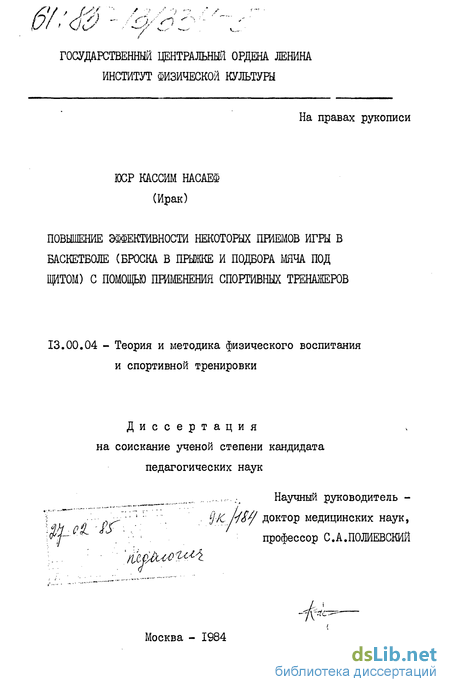 Показатели эффективности мастерства спортсменов были подвергнуты качественному измерению и анализу в большинстве видов спорта. Особый интерес при этом был обращен на технику спортивных движений /26, 58, 60, 73, 102, 108, I4E, 191,204, 223, 242, 261 и др./. Чаще всего в качестве критериев оценки эффективности специальных движений авторами используются точностные показатели /32, 137, 163, 212, 216 и др./, время выполнения приемов /33, 69, 114, 228, 230, 232 и др./ и сравнение двигательного потенциала спортсмена с его достижениями в основном движении /70, 173, 210, 257, 241, 222 и др./. Определенный интерес для нашего исследования представляет оценка эффективности спортивной техники, проведенная В.М.Зациор-ским /70/. Автор регистрировал у акробатов - прыгунов на батуте время нахождения в полете при простых прыжках и при выполнении сальто. Известными формулами механики время полета связано с высотой прыжка и может быть использовано для ее оценки. В прыжках на батуте высокий прыжок - непременное условие высокой оценки. Из табл. I видно, что спортсмены высших разрядов имеют высокие показатели прыгучести, т.е. "двигательного потенциала" и наиболее полно его используют. Соотношение между движением (высотой прыжка, вычисленной по времени полета) при выполнении сальто и тестового задания, оценивающего двигательный потенциал спортсменов, можно представить п. сальто = К х Pi прыжка Коэффициент К, выраженный в %, автор считает возможным применять для оценки эффективности техники спортсменов: чем выше этот коэффициент, тем лучше спортсмен использует свои потенциальные двигательные возможности. Оценка эффективности техники спортивных движений по степени использования показателей двигательного потенциала проводилась не только по уровню развития скоростно-силовых качеств, определяющих результативность кратковременных движений. Возрастающее использование в спортивной науке математических методов регрессионного, дисперсионного и факторного анализа позволило оценить эффективность движений, сопоставляя результативность выполнения приемов с уровнем развития быстроты, силы и выносливости /73, 101, ПО, 173, 222, 241 и др./. В методической и учебной литературе по баскетболу вопросу оценки эффективности важнейших приемов игры в баскетбол посвящено значительное количество работ /2, II, 51, 75, 89, 95, 104, 129, 172, 193, 206, 213, 237, 240 и др./. По мнению большинства авторов, повышение эффективности игровых приемов происходит в большей мере под влиянием изменений правил игры, перестройки техники и тактики, совершенствования методов подготовки. Одним из наиболее важных приемов игры в баскетбол являются броски мяча в корзину с игры. Они составляют 75$ общего счета игры /105/. Следовательно, точность их выполнения является определяющей в результате игры. Для бросков с игры характерным является отсутствие какой-либо стандартности как во времени исполнения, так и в дистанции от кольца /131/. Точность выполнения бросков является одним из основных показателей эффективности владения приемами игры /13, 57, 78, 81, 89, 118, 161, 198, 203 и др./. Наиболее распространенным и рациональным способом выполнения бросков в игре ведущие специалисты считают бросок в прыжке /38, 48, 86, 87, 158, 220, 236, 250 и др./. Наиболее часто игроки используют броски мяча в корзину в прыжке со средней дистанции способом одной рукой сверху /17, 76, 83, 84, 194, 205, 244/. Точность попаданий этих бросков 