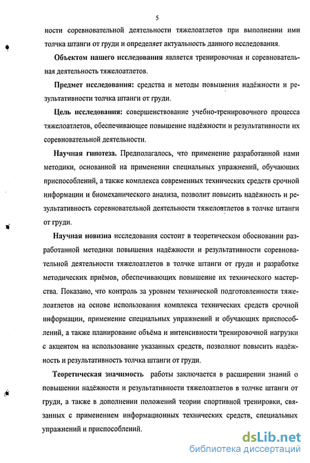 Научная гипотеза. Предполагалось, что применение разработанной нами методики, основанной на применении специальных упражнений, обучающих приспособлений, а также комплекса современных технических средств срочной информации и биомеханического анализа, позволит повысить надёжность и результативность соревновательной деятельности тяжелоатлетов в толчке штанги от груди.