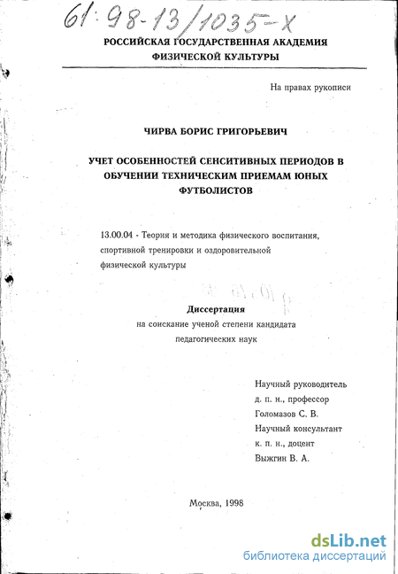 В диссертации впервые проводится анализ влияния возраста, занятий футболом и спортивной тренировки на подготовленность юных футболистов.