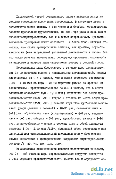 тивных достижений тесно связан с объемом тренировочной работы /42, 96/. Объем тренировочных нагрузок в футболе в свою очередь находится в прямой зависимости от общей выносливости. Развивая аэробные возможности футболистов на начальном этапе обучения, одновременно решают задачи укрепления здоровья (за счет интенсификации развития сердечно-сосудистой и дыхательной систем) и создания основы для воспитания специальной выносливости. Поэтому решение проблемы увеличения общей выносливости и совершенствования методики ее воспитания у юных футболистов представляется важным педагогическим резервом повышения спортивного мастерства.