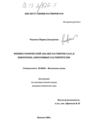 Актуальность темы. Cоздание литиевых источников тока, обладающих высокой энергоемкостью, широким температурным интервалом работоспособности (- 60 +70 0С), хорошей сохранностью (более 10 лет) позволило подойти к разрешению современных проблем автономного энергоснабжения как для задач стратегического назначения, так и в потребительской сфере. Для направленного поиска электролитных композиций для литиевых и литий-ионных источников электрической энергии необходимо более глубокое понимание строения и физико-химических процессов, происходящих в концентрированных растворах электролитов. Описание концентрированных электролитных систем является одной из наиболее сложных проблем современной химии растворов. Для понимания задачи в целом целесообразен комплексный подход к исследованию с привлечением данных, полученных различными методами. С этой целью были использованы денсиметрический и ультраакустический методы, направленные на исследование сольватационных взаимодействий и структуры растворов электролита, вискозиметрический и кондуктометрический методы, позволяющие оценить особенности процессов переноса, определяющих эксплуатационные характеристики источников тока в широком интервале концентраций и температур. В качестве объектов исследования были выбраны растворы LiAsF6 в апротонных растворителях, обеспечивающие хорошую обратимость литиевого электрода, устойчивые по отношению к литию, обладающие высокой электропроводностью и имеющие важное практическое применение.