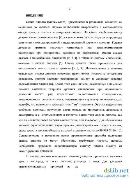 Актуальность темы. Оксид диазота (закись азота) широко используется в микро- и наноэлектронике как реагент для получения слоев легированного и нелегированного диоксида кремния, а также слоев нитрида кремния. К свойствам этих пленок предъявляются такие требования, как надежная электрическая изоляция, высокая стойкость к действию внешних агрессивных сред, минимальная пористость. Чтобы отвечать данным характеристикам оксид диазота должен обладать высокой степенью чистоты (99,999 % и выше). Использование в качестве окислителя оксида диазота позволяет практически исключить гомогенное окисление, которое засоряет реакционную камеру и ухудшает качество образующейся пленки. Кроме того слои окисла, осажденные с помощью реакции окисления гидридов кремния кислородом, при пониженном давлении имеют ряд недостатков: недостаточная конформность, неоднородность плотности слоев, покрывающих ступеньку топологического рельефа, что приводит к дефектам типа "ям" травления. От всех этих недостатков свободны процессы получения слоев окисла из моносилана, дисилана и дихлорсилана с использованием в качестве окислителя оксида диазота, так как он является более мягким окислителем, чем кислород.