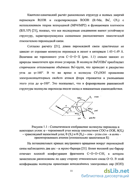 Экспериментальные данные о строении органических гидропероксидов и пероксидов приведены в обзоре [17], из которого видно, что строение и конформационное поведение пероксидов изучены сравнительно мало. Исследования строения гидропероксидов трет-бутила [18], 1,1-дифенилэтана [19] и трифенилметана [20] методами газовой электронографии и рентгеноструктурного анализа выявили общие для всех пероксидов структурные особенности, нуждающиеся в теоретическом обосновании. В связи с этим экспериментальное изучение строения гидропероксидов эффективно дополняется проведением квантово-химических расчётов с использованием современных теоретических подходов. Квантово-химический расчёт равновесных структур и полных энергий пероксидов ROOR и гидропероксидов ROOH (RHVIe, Bu, CF3) с использованием теории возмущений (МР4//МР2) и функционала плотности (B3LYP) [21], показал, что все исследуемые соединения имеют устойчивую структуру, характеризующуюся скошенным расположением заместителей относительно пероксидной связи. Согласно расчёту [21], длина пероксидной связи практически не зависит от строения молекулы пероксида и лежит в интервале 1.45- -1.49 А. Величина же торсионного угла С-О-О—X (рис. 1.1) сильно зависит от природы заместителя при атоме углерода. В молекуле Ви ООВи преобладает стерическое отталкивание объёмных Ви-групп, что приводит к раскрытию угла до ф 160. В то же время в молекуле CF3OOH проявление электроноакцепторных свойств атомов фтора отражается в уменьшении этого угла до ф 100. Это показывает, что в формирование равновесной структуры молекулы пероксида вносят вклад и невалентные взаимодействия. / На потенциальных кривых внутреннего вращения вокруг пероксидной связи наблюдались два цис - и /ирш/с-барьера [21]. Более высокий г/мс-барьер отвечает плоской конфигурации фрагмента С-О-О—С/Н, в котором заместители расположены по одну сторону относительно связи О-О. В этой конформации молекулы ориентация неподелённых электронных пар (НЭП) наименее выгодна, отталкивание НЭП соседних атомов кислорода максимально. В z/иоконформере имеет место и стерическое отталкивание атомов С и R, сильно возрастающее для объёмных заместителей. Для цис -конформера характерно максимальное значение длины связи О-О, обусловленное отталкиванием НЭП.