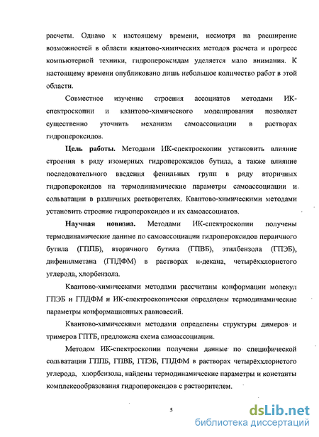 Научная новизна. Методами ИК-спектроскопии получены термодинамические данные по самоассоциации гидропероксидов первичного бутила (ГППБ), вторичного бутила (ГПВБ), этилбензола (ГПЭБ), дифенилметана (ГПДФМ) в растворах н-декана, четырёххлористого углерода, хлорбензола.