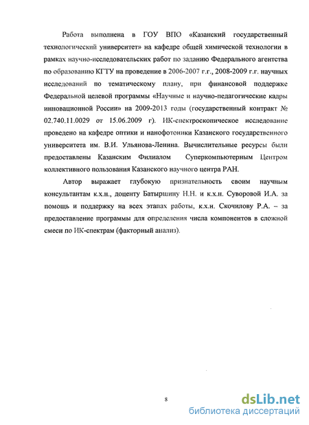 Работа выполнена в ГОУ ВПО «Казанский государственный технологический университет» на кафедре общей химической технологии в рамках научно-исследовательских работ по заданию Федерального агентства по образованию КГТУ на проведение в 2006-2007 г.г., 2008-2009 г.г. научных исследований по тематическому плану, при финансовой поддержке Федеральной целевой программы «Научные и научно-педагогические кадры инновационной России» на 2009-2013 годы (государственный контракт № 02.740.11.0029 от 15.06.2009 г). ИК-спектроскопическое исследование проведено на кафедре оптики и нанофотоники Казанского государственного университета им. В.И. Ульянова-Ленина. Вычислительные ресурсы были предоставлены Казанским Филиалом Суперкомпьютерным Центром коллективного пользования Казанского научного центра РАН.