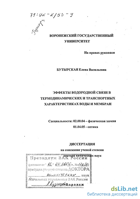 Бутырская Елена Васильевна. Эффекты водородной связи в термодинамических и транспортных характеристиках воды и мембран : диссертация ... доктора химических наук : 02.00.04, 01.04.05.- Воронеж, 2001.- 242 с.: ил. РГБ ОД, 71 02-2/85-9