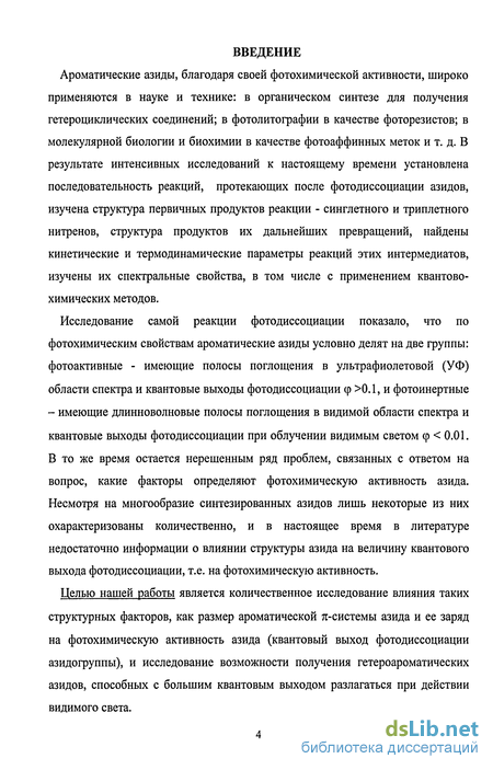 Ароматические азиды, благодаря своей фотохимической активности, широко применяются в науке и технике: в органическом синтезе для получения гетероциклических соединений; в фотолитографии в качестве фоторезистов; в молекулярной биологии и биохимии в качестве фотоаффинных меток и т. д. В результате интенсивных исследований к настоящему времени установлена последовательность реакций, протекающих после фотодиссоциации азидов, изучена структура первичных продуктов реакции - синглетного и триплетного нитренов, структура продуктов их дальнейших превращений, найдены кинетические и термодинамические параметры реакций этих интермедиатов, изучены их спектральные свойства, в том числе с применением квантово-химических методов.