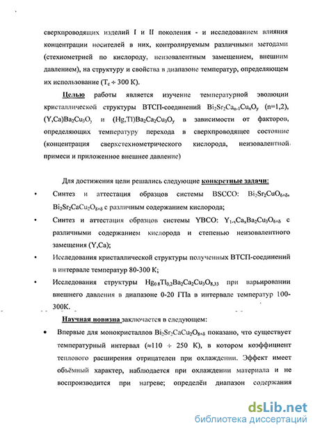 Целью работы является изучение температурной эволюции кристаллической структуры ВТСП-соединений Bi2Sr2Can.iCunOy (n=l,2), (Y,Ca)Ba2Cu3Oy и (Hg,Tl)Ba2Ca2Cu3Oy в зависимости от факторов, определяющих температуру перехода в сверхпроводящее состояние (концентрация сверхстехиометрического кислорода, неизовалентной примеси и приложенное внешнее давление).