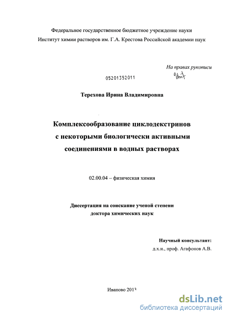 Апробация работы. Результаты работы были представлены и обсуждены на IX, XI Международной конференции «Проблемы сольватации и комплексообразования в растворах» (Плес 2004, Иваново 2011); International Conference on Supramolecular Science and Technology (Prague, 2004); III, IV International Symposium «Molecular Design and Synthesis of Supramolecular Architectures» (Казань 2004, 2006); XV, XVI, XVII, XVIII Международной конференции по химической термодинамике в России (Москва 2005, Суздаль 2007, Казань 2009, Москва 2013); Conference on Thermal Analysis and Calorimetry (Zakopane 2005, 2009, 2012); X International Seminar on Inclusion Compounds (Казань, 2005); 9-th European Symposium on Thermal Analysis and Calorimetry (Cracow, 2006); International Summer School «Supramolecular systems in chemistry and biology» (Tuapse, 2006, 2008); Всероссийском симпозиуме «Эффекты среды и комплексообразования в растворах» (Красноярск 2006); XIII, XVI Симпозиуме по межмолекулярным взаимодействиям и конформациям молекул (С.-Петербург 2006, Иваново 2012); XV International Conference «Physical methods in coordination and supramolecular chemistry» (Kishinev, 2006); XXIII, XXUIV XXV Чугаевской конференции по химии комплексных соединений (Одесса 2007, С.-Петербург 2009, Суздаль 2011); International Symposium and Summer School «Nuclear Magnetic Resonance in Condensed Matter» (St.-Petersburg, 2007); 8, 9, 11-th Mediterranean Conference on Thermal Analysis and Calorimetry (Palermo 2007, Porto 2011, Athens 2013);