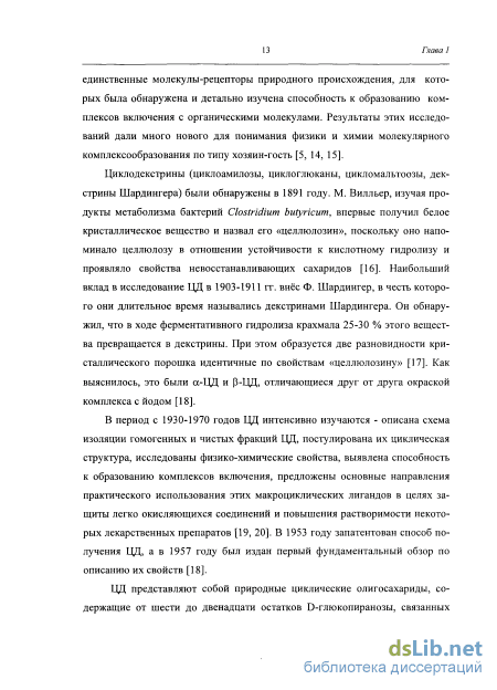 За относительно короткое время супрамолекулярная химия превратилась в обширную область знаний, включающую несколько направлений, одним из которых является химия циклодекстринов. Циклодекстрины (ЦД) — Глава единственные молекулы-рецепторы природного происхождения, для которых была обнаружена и детально изучена способность к образованию комплексов включения с органическими молекулами. Результаты этих исследований дали много нового для понимания физики и химии молекулярного комплексообразования по типу хозяин-гость [5, 14, 15].