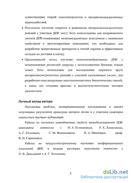 Работы по кондуктометрическому изучению конформационных изменений ДНК в водных растворах выполнены совместно с О. В. Давыдовой и А. Г. Козловым.