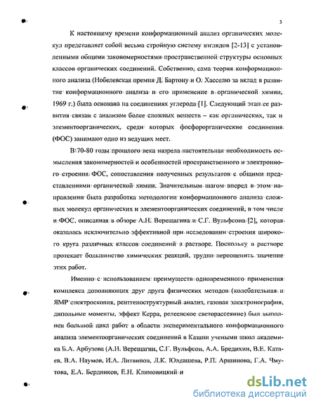 Именно с: использованием: преимуществ; одновременного применения комплекса дополняющих друг друга физических методов (колебательная, и ЯМР спектроскопия, рентгеноструктурный,анализ, газовая электронография; дипольные моменты, эффект Керра, релеевское светорассеяние) был выполнен большой цикл работ в области экспериментального конформапионного анализа элементоорганических соединений в Казани учеными школ академика Б.А. Арбузова (А.Н. Верещагин, С.Г. Вульфсон, А.А. Бредихин, В.Е. Катаев, В.А. Наумов И.А. Литвинов, Л.К. Юлдашева, Р.П; Аршинова; ГГ.А. Чму-това, Е.А.. Бердников, Е,Н. Климовицкий- и др.); члена-корреспондента РАН Л.Н, Пудовика (Э.А; Ишмаева, И.И: Пацановский и др.), профессора Ю.Ю. Самитова (А.В. Ильясов, А.А. Аганов, P.M. Аминова, В.В. Клочков,.Ф.-Х. Каратаева, Т.А..Зябдикова и др.) и профессора;Р.Р: Шагидуллина (О.А,.Раев-ский; С.А. Кацюба, И;Х. Шакиров и др.), а также профессором А.Б. Ремизовым и канд. хим. наук В3. Зверевым,,отраженный в ряде обзоров [3-13]. Современное состояние конформационного анализа ФОС во многом; обязано работам ученых этих школ.