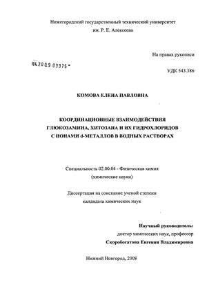 никеля, меди, цинка и кадмия: константы комплексообразования и степени комплексообразования в зависимости от соотношения лиганд : ион металла. - Роль водородных связей при участии протонированных аминных групп гидрохлоридов глюкозамина и хитозана в образовании внутренней сферы комплексов с ионами металлов.