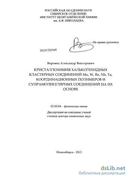 Благодарности. Получение дифракционных данных в некоторых случаях стало возможным благодаря помощи к.х.н. А.В. Герасименко (Институт химии ДВО РАН, Владивосток), к.х.н. Д.Ю. Наумова (ИНХ СО РАН, Новосибирск). Кристаллохимический анализ результатов проводился автором при участии к.х.н. Е.В. Пересьшкиной, к.х.н. С.Б. Артёмкиной и к.х.н. Д.Г. Самсоненко (ИНХ СО РАН, Новосибирск), д.х.н. проф. В.А. Блатова и Е.В. Александрова (Самарский госуниверситет). Монокристаллы для исследования были предоставлены сотрудниками ИНХ СО РАН к.х.н. П.А. Абрамовым, к.х.н. С.А. Артёмкиной, к.х.н. К.А. Брылевым, д.х.н. О.А. Герасько, к.х.н. Д.Н. Дыбцевым, к.х.н. А.Л. Гущиным, к.х.н. И.А. Калининой, к.х.н. К.А. Коваленко, к.х.н. А.Ю. Ледневой, д.х.н. Ю.В. Мироновым, д.х.н. Н.Г. Наумовым, к.х.н. Д.Г. Самсоненко, д.х.н. проф. М.Н. Соколовым, к.х.н. М.С. Тарасенко, чл.-корр. РАН д.х.н. проф. В.П. Фединым, д.х.н. проф. В.Е. Федоровым, к.х.н. Е.В Чубаровой. Автор выражает всем своим соавторам искреннюю признательность за многолетнее плодотворное сотрудничество.