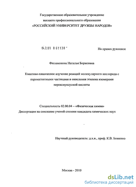 Личный вклад автора. Выполнен весь объем работ по расчетам реакций радикалов ОН' и ООН' с синглетным и триплетным дикислородом и реакций окисления этилена изомерами пероксиуксусной кислоты. Проведен анализ полученных результатов, сформулированы основные положения, выносимые на защиту, и выводы из работы.