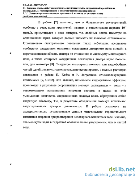 В работе [7] показано, что в большинстве растворителей, особенно в воде, ионы красителей, начиная с концентрации порядка 10"3 моль/л, присутствуют в виде димеров, т.е. двойных ионов, несмотря на одноимённый заряд, который должен вызывать их взаимное отталкивание. Относительно спектрального поведения таких небольших ассоциатов сообщается следующее: максимум поглощения димерного иона смещён в коротковолновую область спектра по отношению к максимуму мономерного иона, а также молярный коэффициент поглощения димера вдвое больше, чем., для мономера [8]. Тенденция неполярных молекул или гидрофобных частей одной молекулы самопроизвольно ассоциировать в водных растворах освещается в работе П. Хобза и Р. Заградника «Межмолекулярные комплексы» [9, С.262]. Это явление, называемое гидрофобным эффектом, происходит в результате реорганизации молекул растворителя — воды — и сопровождается возрастанием энтропии системы в целом за счёт уменьшения количества упорядоченных молекул воды, образующих собой гидратную оболочку, Т.е.? в результате объединения молекул количество гидратированных центров уменьшается. В работе ссылаются на экспериментально установленные данные относительно отрицательного изменения энтропии при растворении неполярного вещества в воде. Указано, что молекулы воды в гидратной оболочке более упорядочены, чем в чистой воде.
