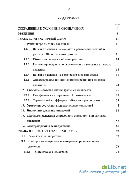 В первой главе изложены теоретические основы применения высокого давления при осуществлении химических реакций, рассмотрены дифференциальные характеристики объема индивидуальных жидкостей, подробно описаны и проанализированы эмпирические и полуэмпирические уравнения состояния жидкостей, представлены экспериментальные методы исследования барической кинетики и измерения сжимаемости жидкостей, рассмотрено понятие внутреннего давления жидкости, также рассмотрено явление электрострикции растворителей.