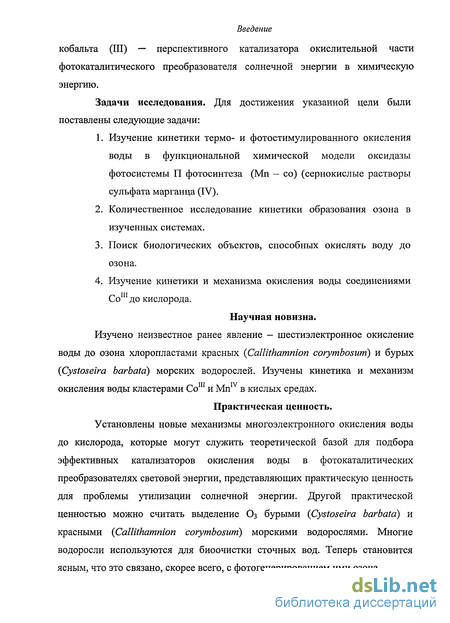 кислорода, на основе кластеров переходных металлов кобальта(Ш) и марганца (IV), а также поиск природных фотосинтезирующих организмов, способных окислять воду до озона.